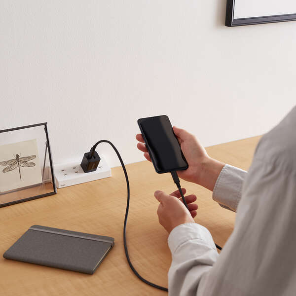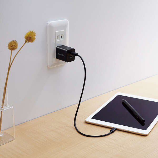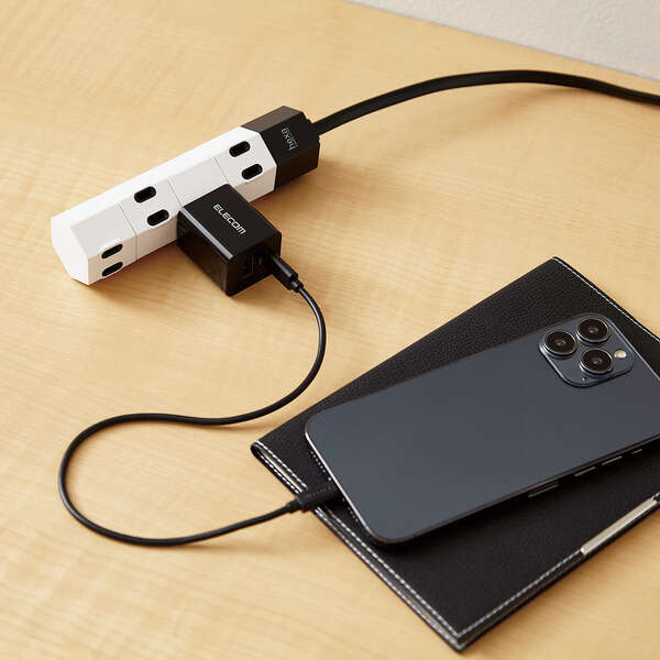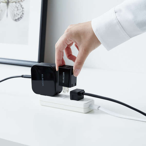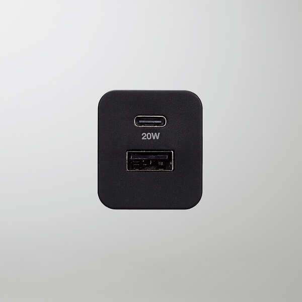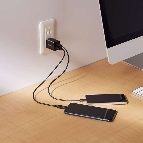 スマートフォンやタブレットなどの充電を、これ1台で。USB Type-C(TM)ポートとUSB-Aポートを搭載し、対応するスマートフォンなどを高速充電できるAC充電器です。手のひらにすっぽり収まるコンパクトサイズと軽量で、外出や出張などの持ち運びに便利です。