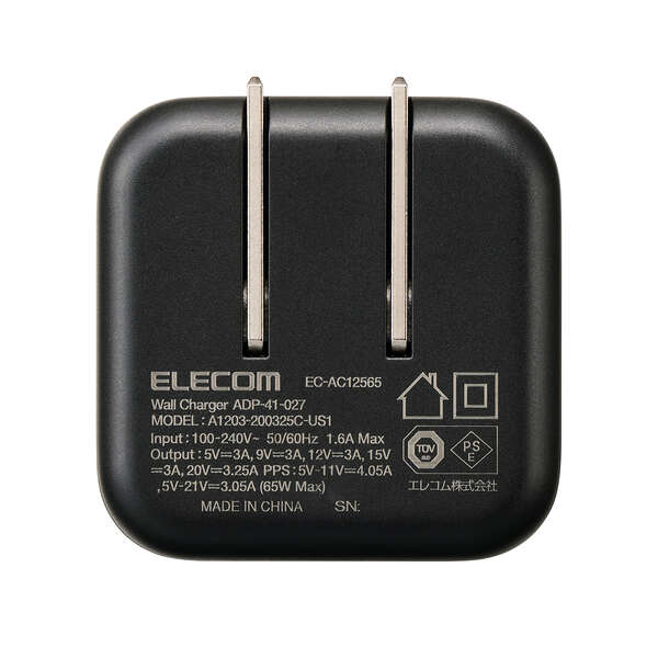 USB Power Delivery 65W AC充電器(C-Cケーブル付属/1.5m)(EC-AC12565BK)