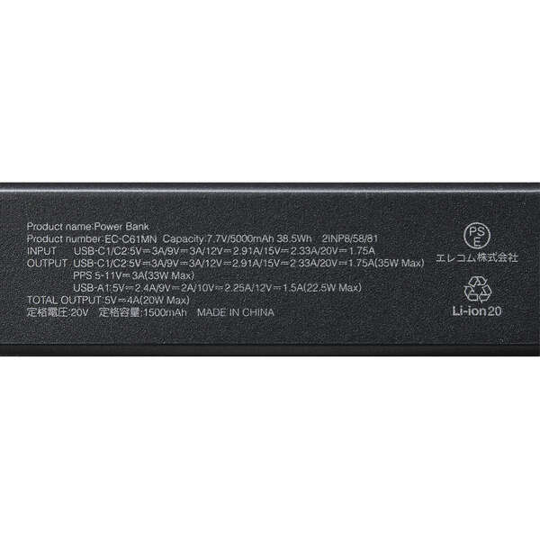 USB Type-C1/C2:最大35W(5V/3A、9V/3A、12V/2.91A、15V/2.33A、20V/1.75A)・PPS最大33W(5~11V/3A)、USB-A1:最大22.5W(5V/2.4A、9V/2A、10V/2.25A、12V/1.5A)、複数ポート同時使用時:合計最大20W(5V/4A)