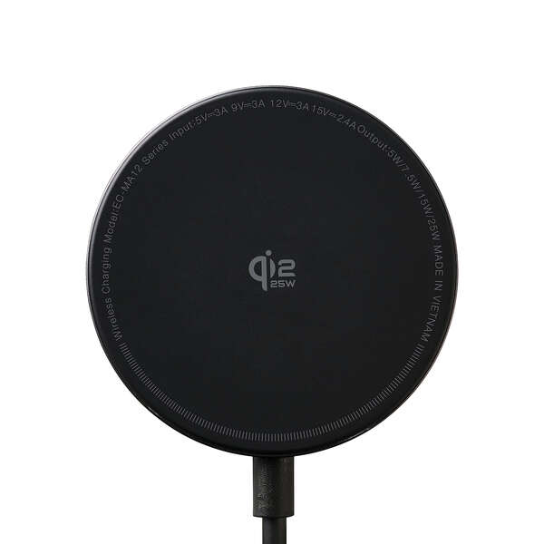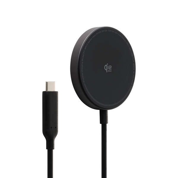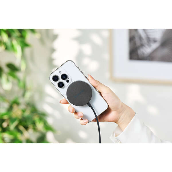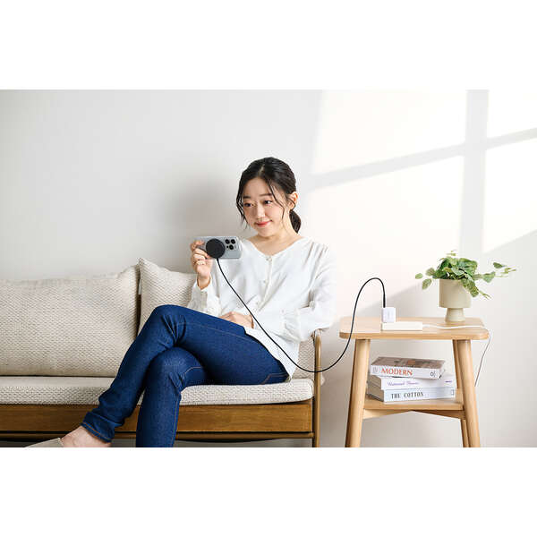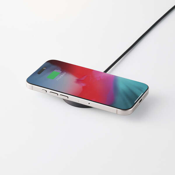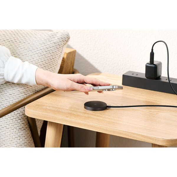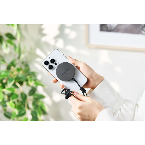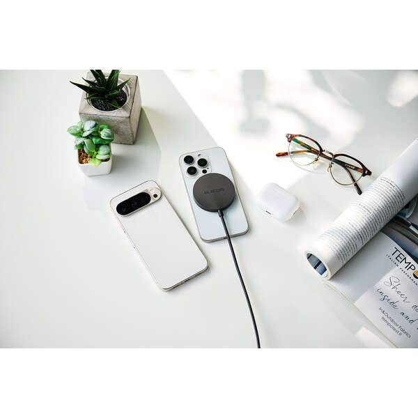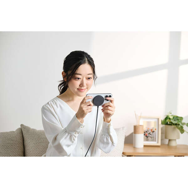 最大25W出力で、ワイヤレス充電がもっと速くなる。Qi2 25W対応のスマートフォンを高速充電できる、マグネット式ワイヤレス充電器です。基板をコネクター側に分散することで、発熱を抑える設計。スマートフォンの背面にぴったりくっつき、操作しながらの充電も快適です。