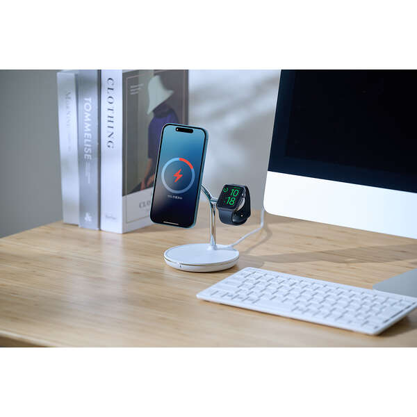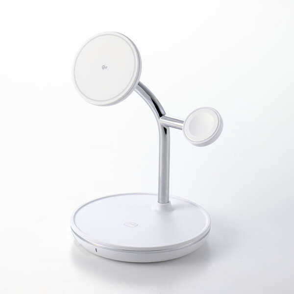 デバイスが綺麗にまとまる3in1。iPhoneなどの対応するスマートフォン・Apple Watch・対応するAirPodsを3台同時に充電できるQi2規格ワイヤレス充電スタンドです。1カ所にアイテムをまとめられ、充電状態も一目で確認できます。iPhoneスタンド部は角度調整が可能で、着信の確認や動画視聴など、見やすい角度に柔軟に調整できます。