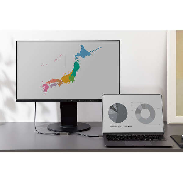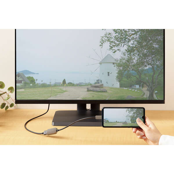 パソコンやスマートフォンなどの映像をディスプレイなどに出力できる、USB Type-C(TM)ポートをHDMI(R)ポートに変換するアダプターです。HDMIコネクター搭載ディスプレイなどに映像を出力することができ、画面複製と画面拡張に対応しています。