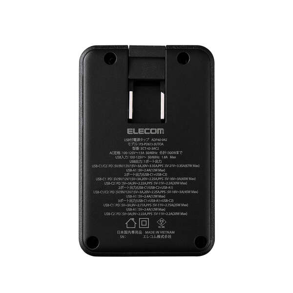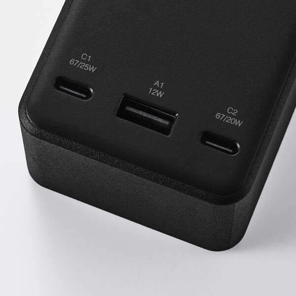 USB側定格出力(1ポート使用時) USB Type-C1/C2ポート:67W(5V/3A,9V/3A,12V/3A,15V/3A,20V/3.35A)、PPS:67W(5V-21V/3.35A) USB-A1ポート:12W(5V/2.4A)