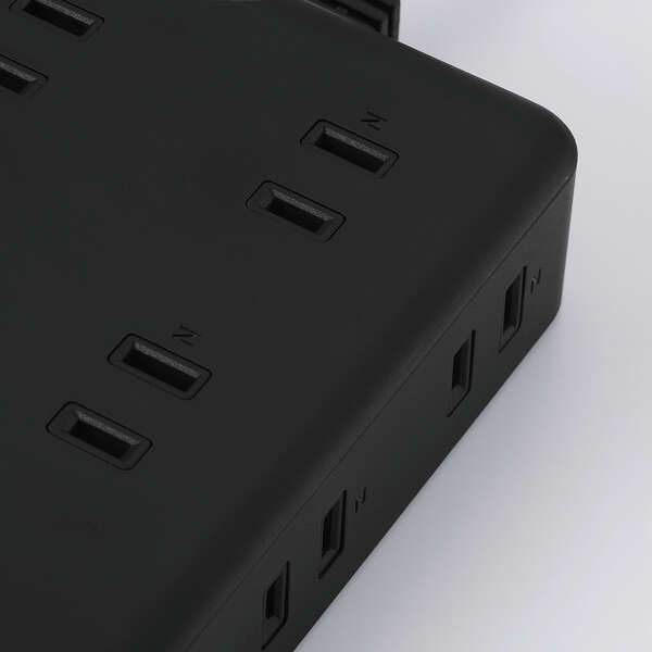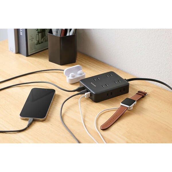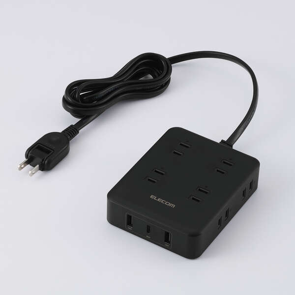 デスク周辺の電源をひとまとめに!8つのAC差込口、2つのUSB-Aポート、1つのUSB Type-C(TM)ポートが一体になったUSBタップです。最大11台のデバイスを接続でき、コンセント周りをスッキリ整理できます。差込口をゆとりのある間隔で側面にも配置し、アダプター同士が干渉するのを防ぎながらも設置の邪魔にならないコンパクト設計です。