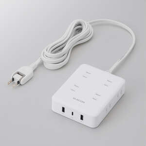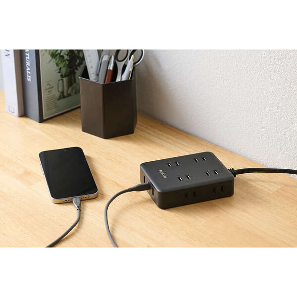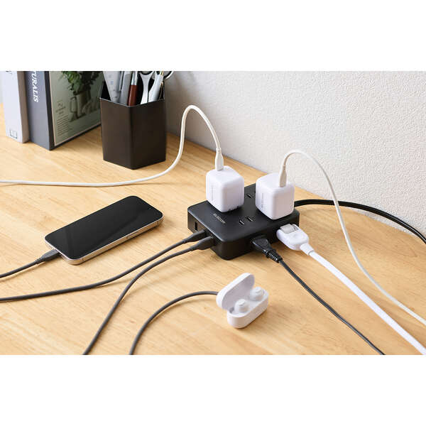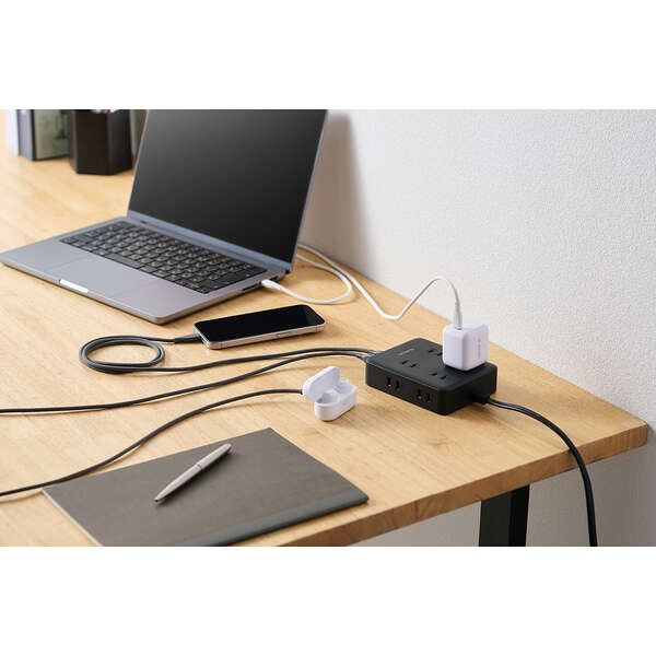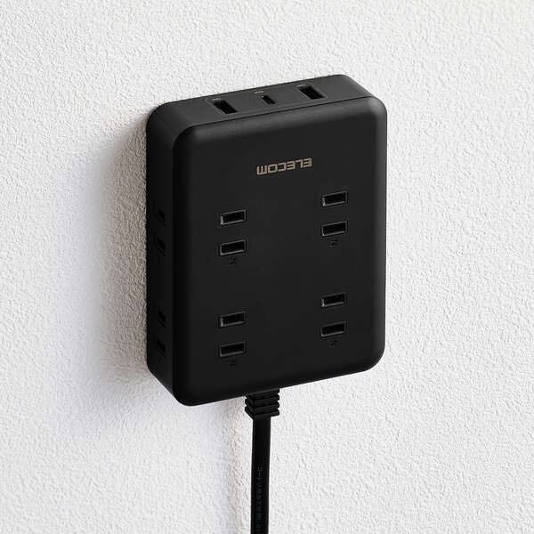 デスク周辺の電源をひとまとめに!8つのAC差込口、2つのUSB-Aポート、1つのUSB Type-C(TM)ポートが一体になったUSBタップです。最大11台のデバイスを接続でき、コンセント周りをスッキリ整理できます。差込口をゆとりのある間隔で側面にも配置し、アダプター同士が干渉するのを防ぎながらも設置の邪魔にならないコンパクト設計です。
