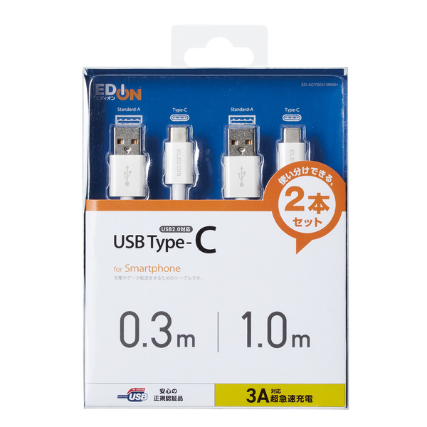 自宅で使用するのに便利な約1.0mと、外出時にモバイルバッテリーなどと接続するのに便利な約0.3mの2本セット。 取り回しがしやすく丈夫なやわらか耐久ケーブルで、USB Standard-A端子を搭載したパソコン・充電器と、USB Type-C端子を搭載したスマートフォンなどの接続ができるUSB2.0ケーブル。