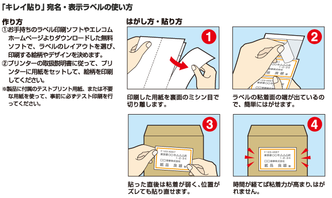 「キレイ貼り 宛名・表示ラベル」は、特殊粘着剤により、台紙からはがして貼り付けた直後は粘着力が弱いため、ラベルがゆがんだり曲がってしまっても、はがして貼り直すことができます。貼り付けが完了したら、時間の経過とともに粘着力が強くなりますので、郵送時にはがれてしまう心配もありません。一度で上手く貼り付けられなくても、貼り直しができるので、細かい作業が苦手な方でも、キレイに貼り付けられる製品になっています。