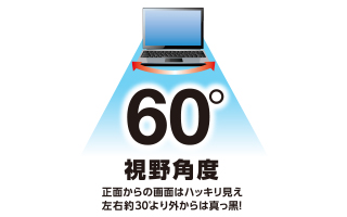 画面の正面を中心に60°(左右約30°)より外の角度からは画面がまっ黒に見えるので、パソコン画面を見られる心配がありません。