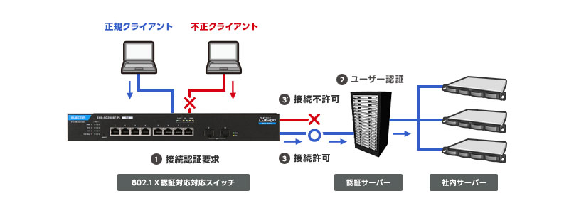 RADIUSサーバーと連携することで不正接続を未然に防ぎ、ネットワークの安全性を高めます。