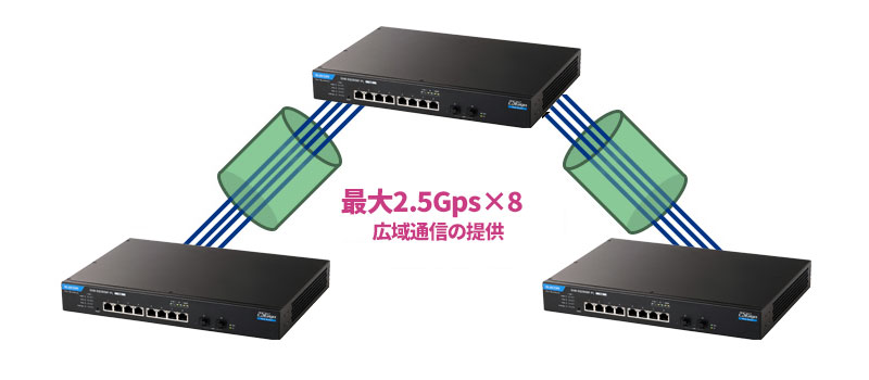 ポートを複数束ねることでバックボーン帯域拡張を提供するとともに冗長性を提供することでケーブル障害時にも通信断を防ぎます。