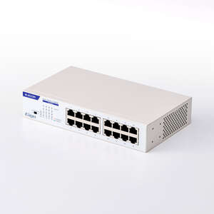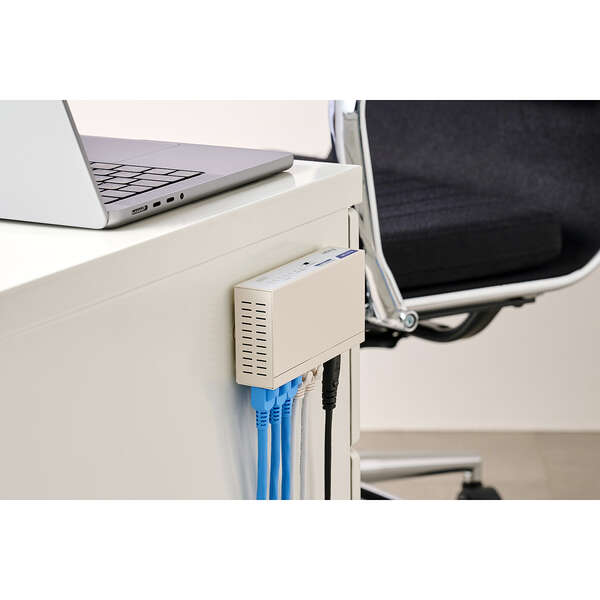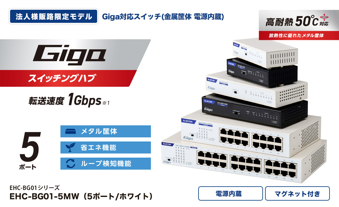 省スペースに設置可能なコンパクトモデル。 ファンレスで耐熱50℃に対応し、ループ検知機能も搭載したGiga対応、電源内蔵のメタル筐体5ポートハブです。