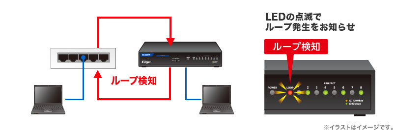 LEDランプの点滅によりネットワークループ発生をお知らせし、ネットワーク障害の解消を促します。