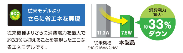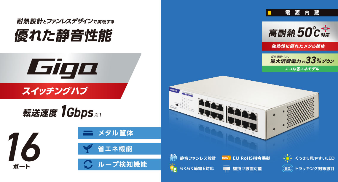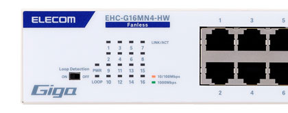 最大消費電力が従来機種(※)より33%ダウンの省エネモデル。ファンレスで耐熱50℃に対応し、ループ検知機能も搭載したGiga対応、電源内蔵のメタル筐体16ポートハブです。 ※従来機種:EHC-G16MN2-HW