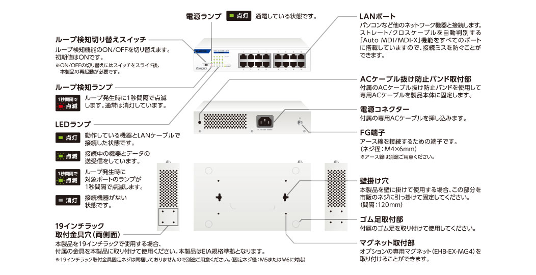 Giga(1000BASE-T)対応、電源内蔵のメタル筐体16ポートスイッチングハブです。 ストレート/クロスケーブルを自動判別する「Auto MDI/MDI-X」機能を全てのポートに搭載。接続ミスを防ぎます。
