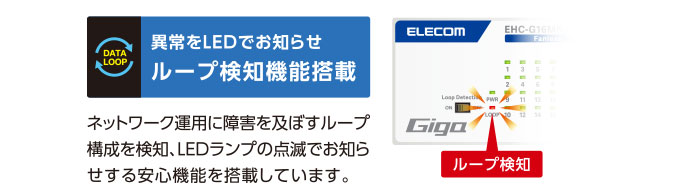 ループ検知機能を搭載しています。 LEDランプの点滅によりネットワークループ発生をお知らせし、ネットワーク障害の解消を促します。