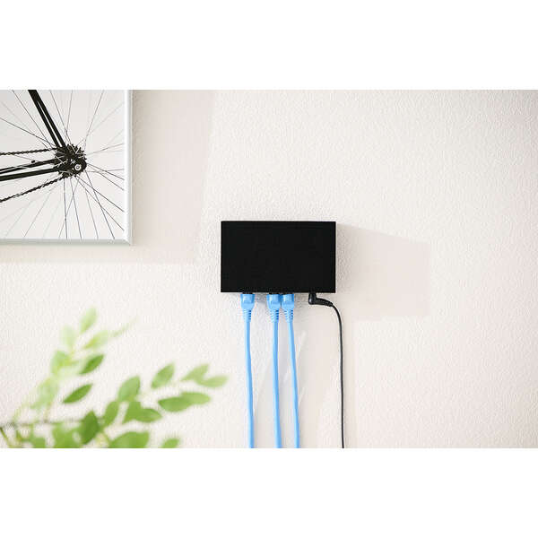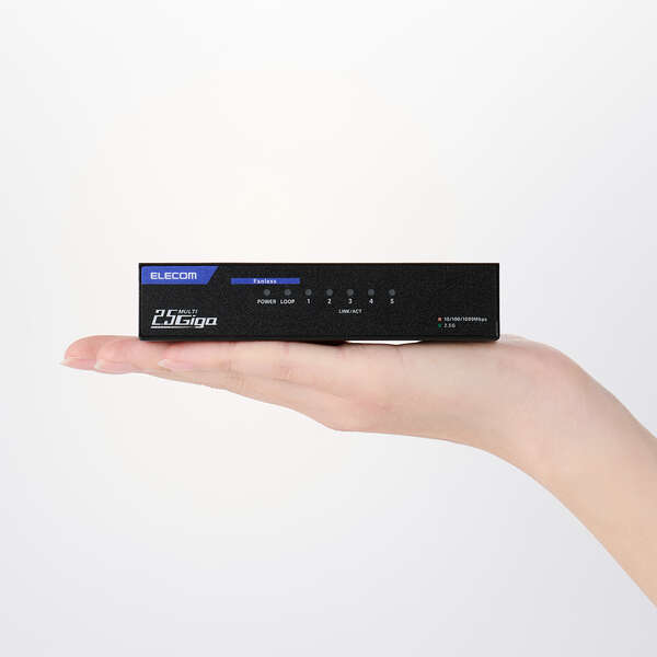 全ポート2.5Gbpsに対応した5ポートのスイッチングハブです。片手で持てるコンパクトサイズでファンレス設計のため、動作音が気になりません。家庭やオフィスなどさまざまなシーンで活躍します。パソコンはもちろん、ゲーム機やテレビなど幅広い有線機器との接続にもおすすめです。