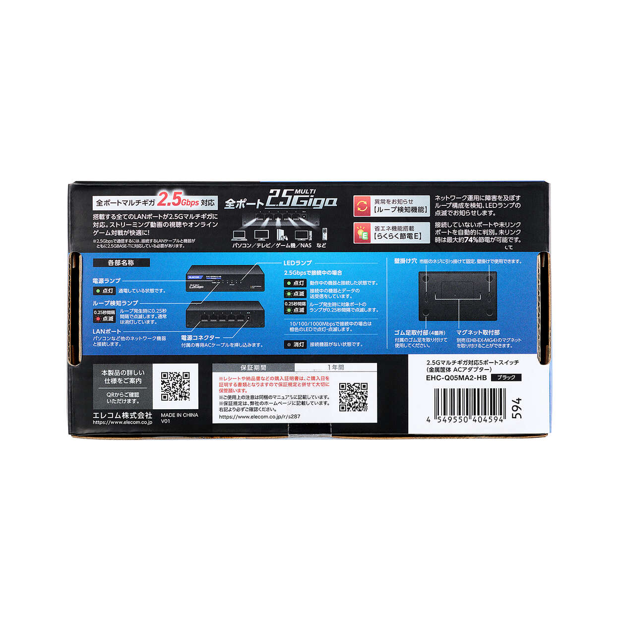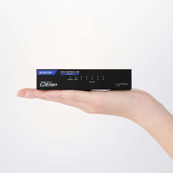 全ポート2.5Gbpsに対応した5ポートのスイッチングハブです。片手で持てるコンパクトサイズでファンレス設計のため、動作音が気になりません。家庭やオフィスなどさまざまなシーンで活躍します。パソコンはもちろん、ゲーム機やテレビなど幅広い有線機器との接続にもおすすめです。