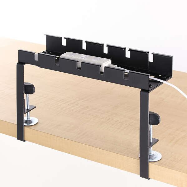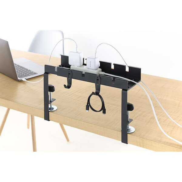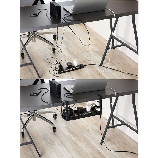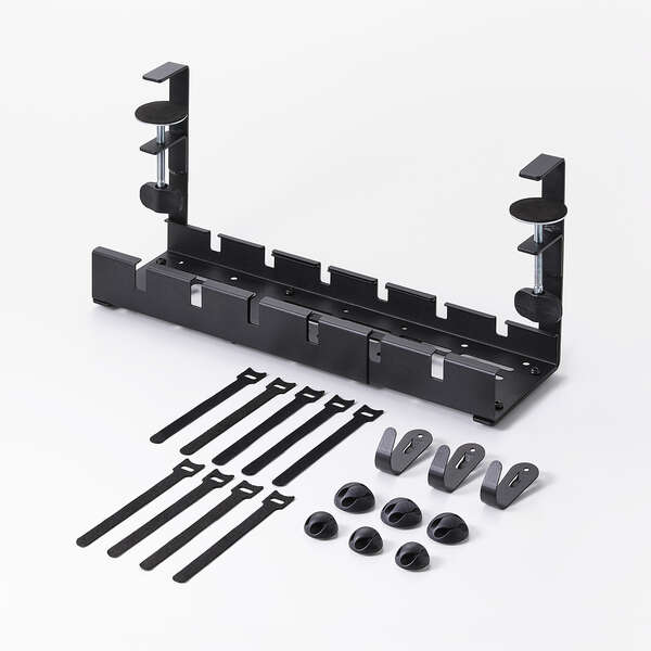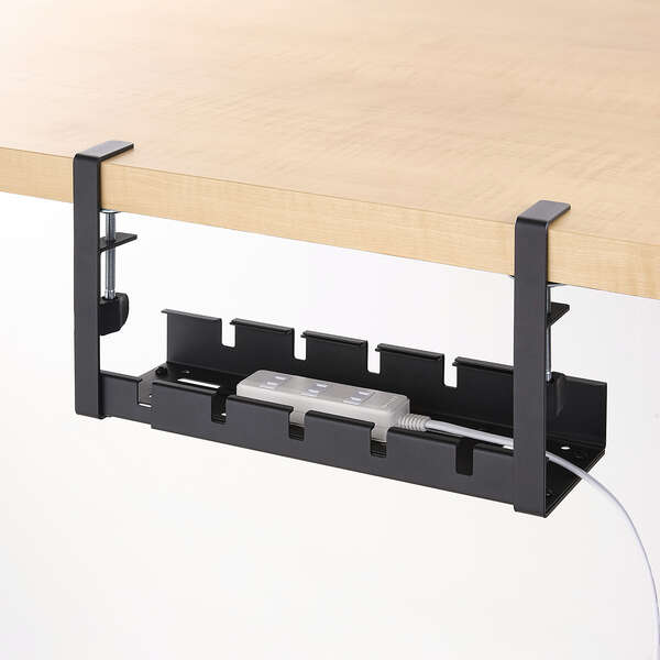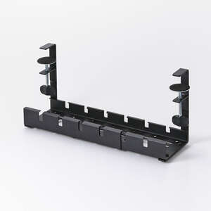 机の上も足元もすっきり。ケーブル配線をまとめられる伸縮タイプのケーブルトレーです。ごちゃつきがちなケーブルやタップをデスク下に収納でき、作業スペースが広がって見た目もスマートに。テーブルの上に設置すれば、デスクトレーとして小物整理にも役立ちます。