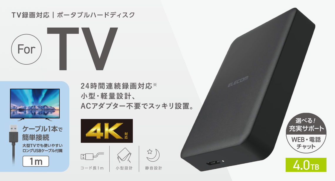 テレビやレコーダーなどの機器に接続し、番組の録画ができるポータブルハードディスクです。