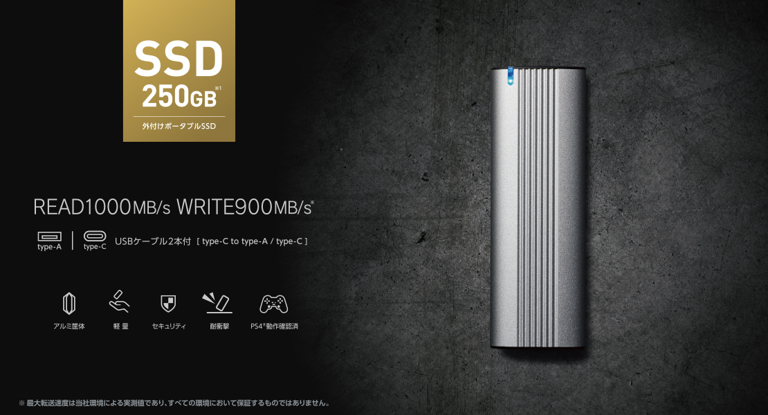 読み込み最大1000MB/sの超高速データ転送を実現するUSB3.2(Gen2)対応の外付けポータブルSSDです。