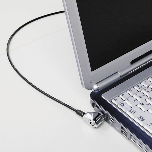 ノートパソコンの専用スロットにセキュリティワイヤーロックを差し込むだけでノートパソコンを盗難から守ります。