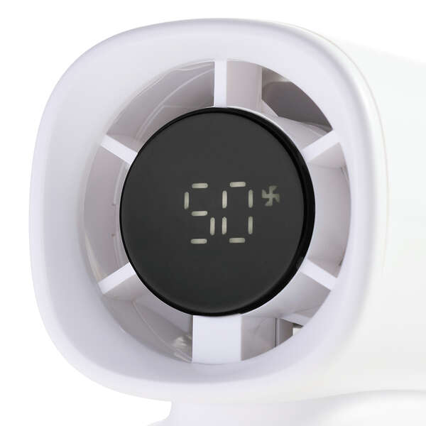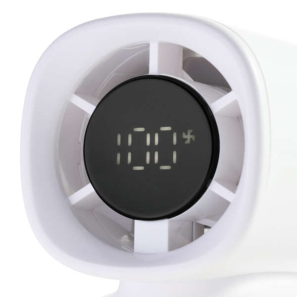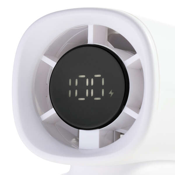 風量・充電・残量が数字でひと目で分かるお知らせ表示付き。外出前に充電残量をチェックできるので、安心して持ち歩けます。