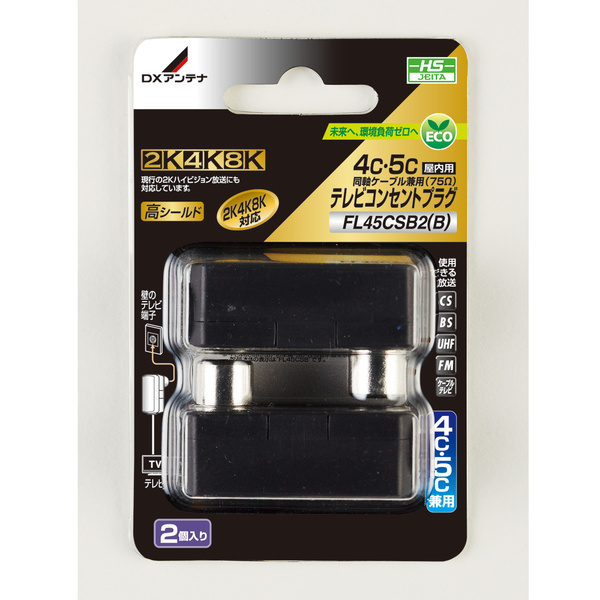 テレビコンセントから電波をワンタッチで取り出す同軸ケーブル用(75Ω)プラグです。既存の2K放送から4K・8K(3224MHz)放送の周波数帯域に対応しています。簡単な加工で誰でも簡単に接続できます。4C、5Cケーブルどちらにも適合する兼用タイプです。心線の接続状態が確認できる窓付なので確実に組立できます。他の電波との干渉を防ぐ高シールド構造です。ケーブルの両端加工に便利な2個入りです。ブリスターパック商品。 本体色ブラック。