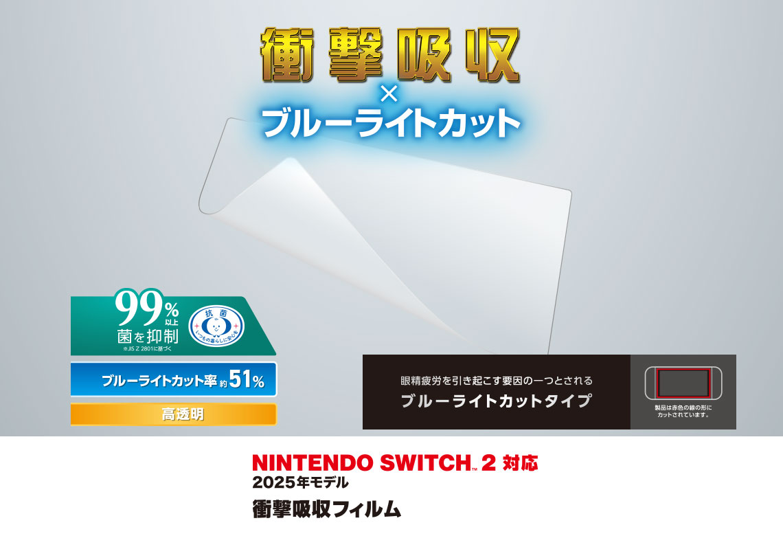 NINTENDO SWITCH(TM)2 の画面を傷や汚れから守る、ブルーライトカット・高透明タイプの衝撃吸収フィルムです。