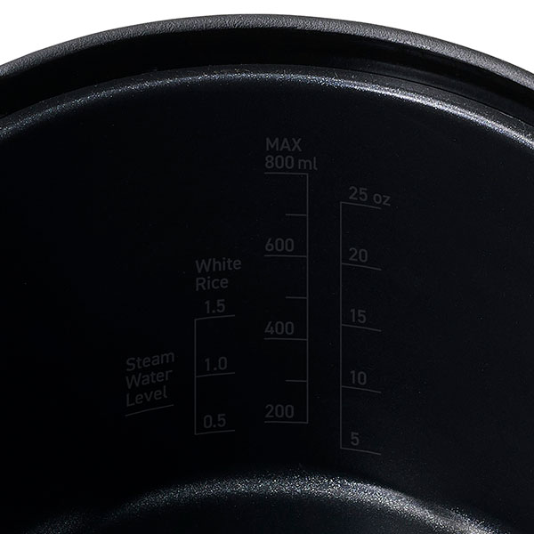 内釜には調理用目盛り(蒸し・炊飯)と容量目盛りを刻印しています。