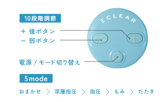 深く届く最大周波数550Hzで痛みや神経痛を効果的にやわらげる「深層指圧」モード、ハンドマッサージを追求した「指圧」「もみ」「たたき」モード、これら4種のモード切替のほか、4種のモードを交互に繰り返す「おまかせ」モードの計5つのモードを搭載しています。強さは10段階で調節可能です。