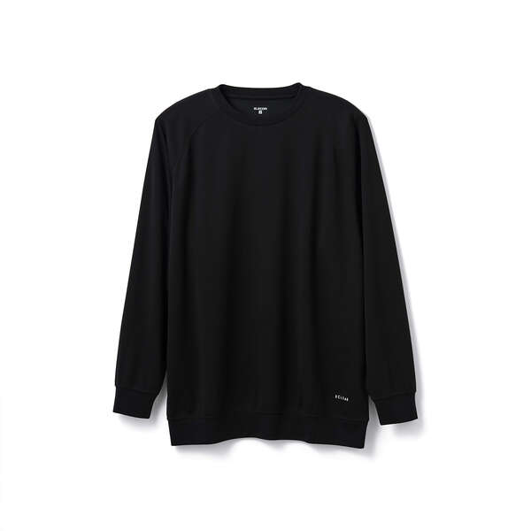開きすぎず絶妙なゆったり感とストレッチ性のクルーネックで、首元を締めつけず適度な保温性もあり、リラックスして着られます。