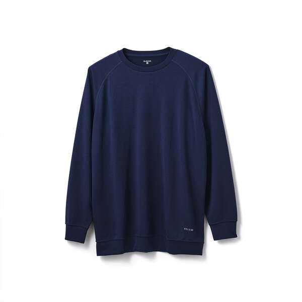 開きすぎず絶妙なゆったり感とストレッチ性のクルーネックで、首元を締めつけず適度な保温性もあり、リラックスして着られます。