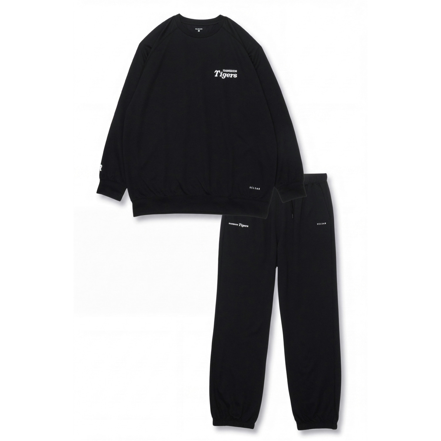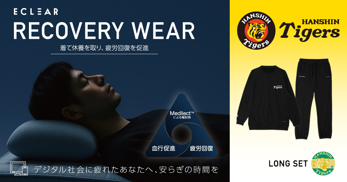毎日のオフを、タイガースと心地よく。公式ロゴをさりげなくあしらった阪神タイガースモデルが登場!デスクワークや運動後の疲れた筋肉をやさしくケアするECLEAR リカバリーウェアの長袖トップスとロングパンツのセットです。