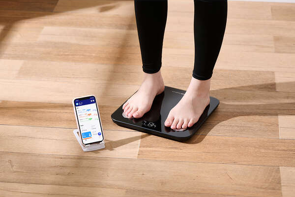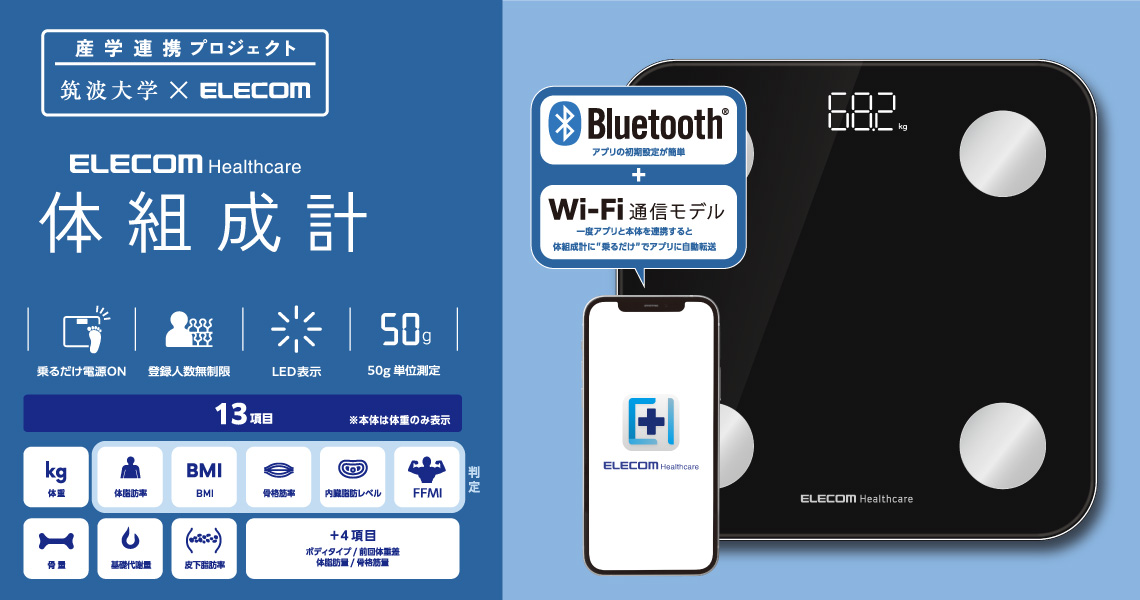 Bluetooth®で簡単にアプリに接続して初期設定ができ、Wi-Fi通信で測定データを専用アプリ「ELECOM Healthcare」(エレコム ヘルスケア)に転送できる、Bluetooth+Wi-Fi通信機能搭載体組成計です。