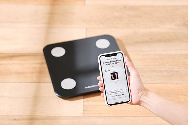 本製品とスマートフォンをBluetooth接続してアプリ初期設定を行い、専用アプリ「ELECOM Healthcare」へのデータ転送・自動保存はWi-Fi通信で行います。手軽にアプリに接続して初期設定ができ、毎日の測定時も本体に乗るだけで簡単に記録できます。