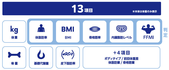 専用アプリ「ELECOM Healthcare」で13項目(体重・体脂肪率・BMI・基礎代謝量・骨格筋率・内臓脂肪レベル・骨量・皮下脂肪率・FFMI・ボディタイプ・前回体重差・体脂肪量・骨格筋量)を確認できます。