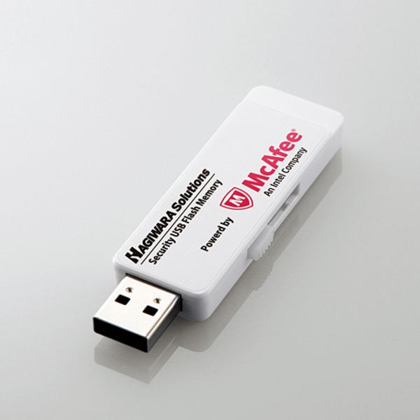 マカフィ社製ウイルスチェック機能搭載、パスワードロック機能、保存するデータ全てを強制的に暗号化するセキュリティUSBメモリ。