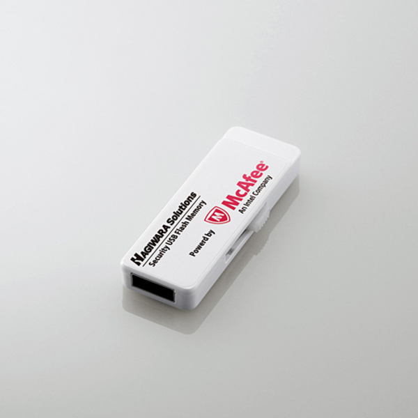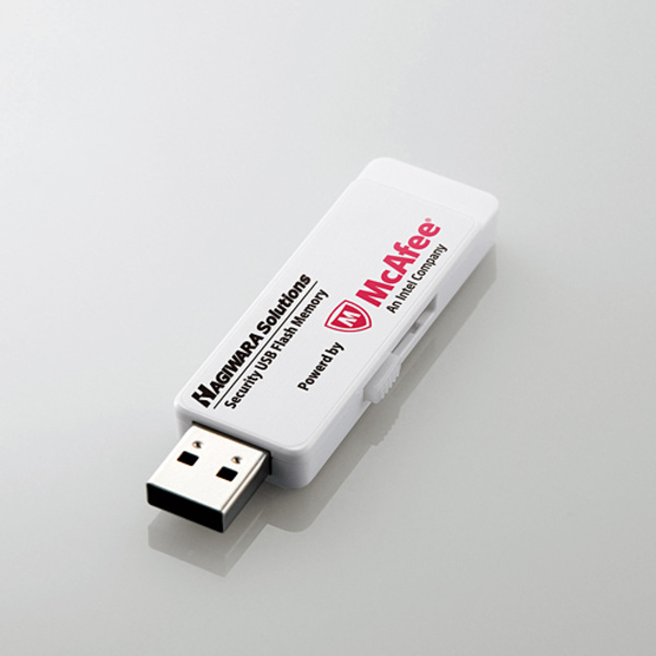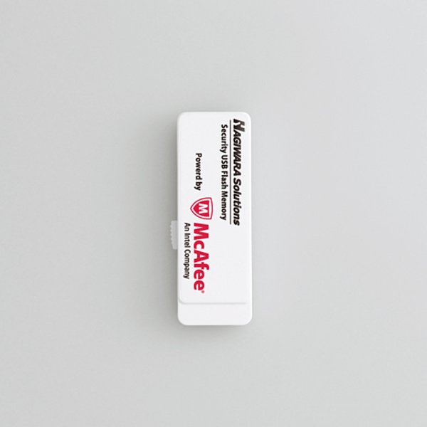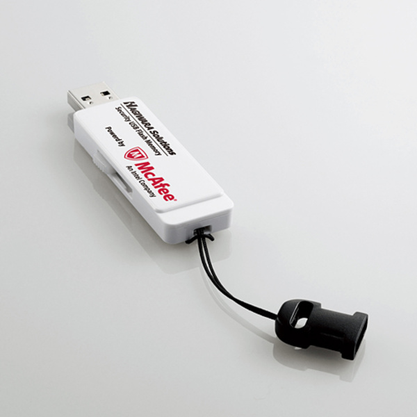 マカフィ社製ウイルスチェック機能搭載、パスワードロック機能、保存するデータ全てを強制的に暗号化するセキュリティUSBメモリ。