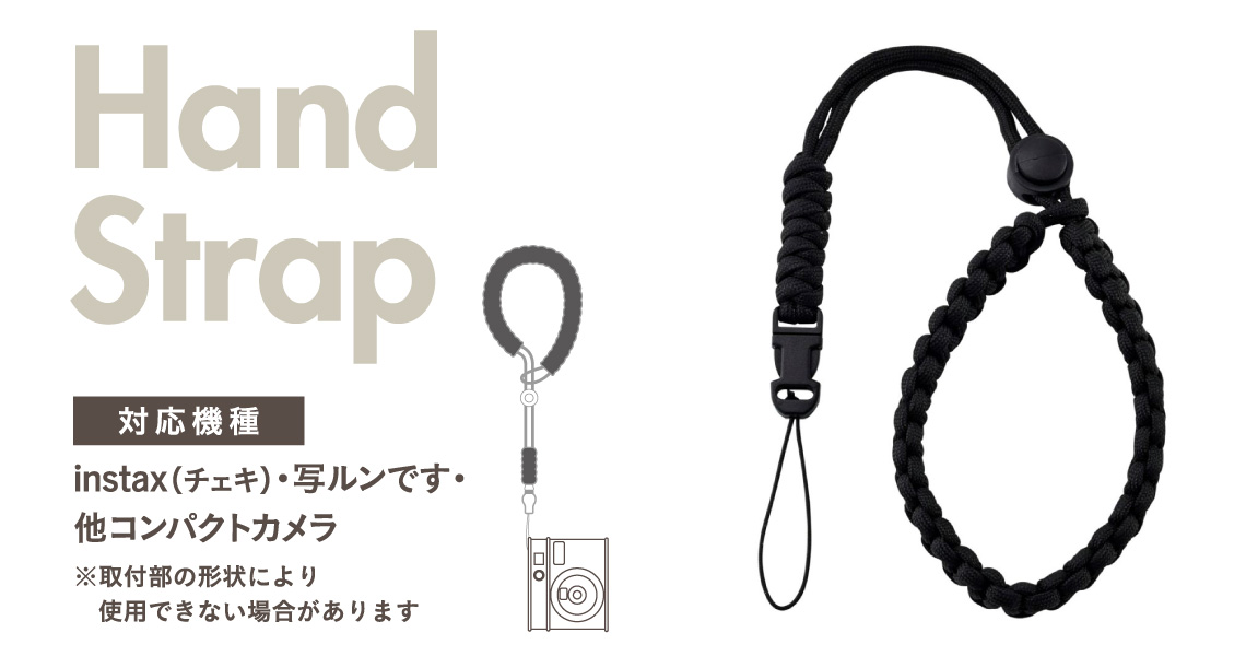 “instax”(チェキ)や“写ルンです”など、幅広いコンパクトタイプのカメラに使えるハンドストラップです。