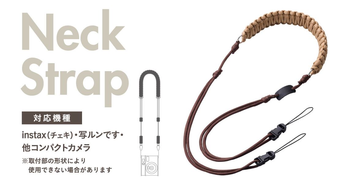“instax”(チェキ)や“写ルンです”など、幅広いコンパクトタイプのカメラに使えるネックストラップです。