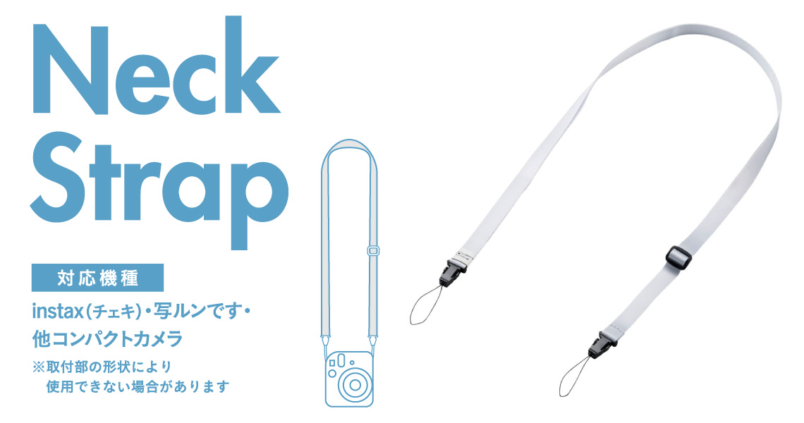 nstax”(チェキ)や“写ルンです”など、幅広いコンパクトタイプのカメラに使えるネックストラップです。