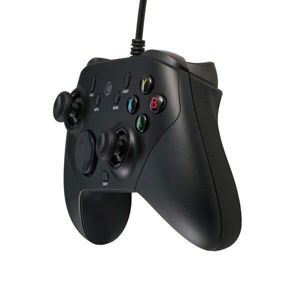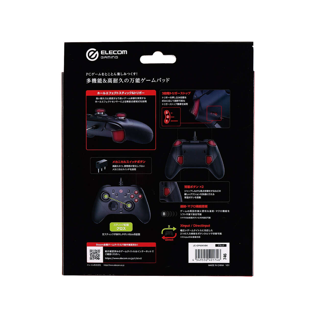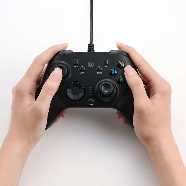 XInput/DirectInputの両方に対応した、多機能で高耐久な万能ゲームパッドです。スティックとトリガーにホールエフェクト技術を採用することで、高い耐久と優れた操作性を実現しています。さらに、背面ボタンの搭載により、複雑で高度な操作もスムーズに行えます。クロススティック配置(Xbox系)の有線振動対応ゲームパッドです。