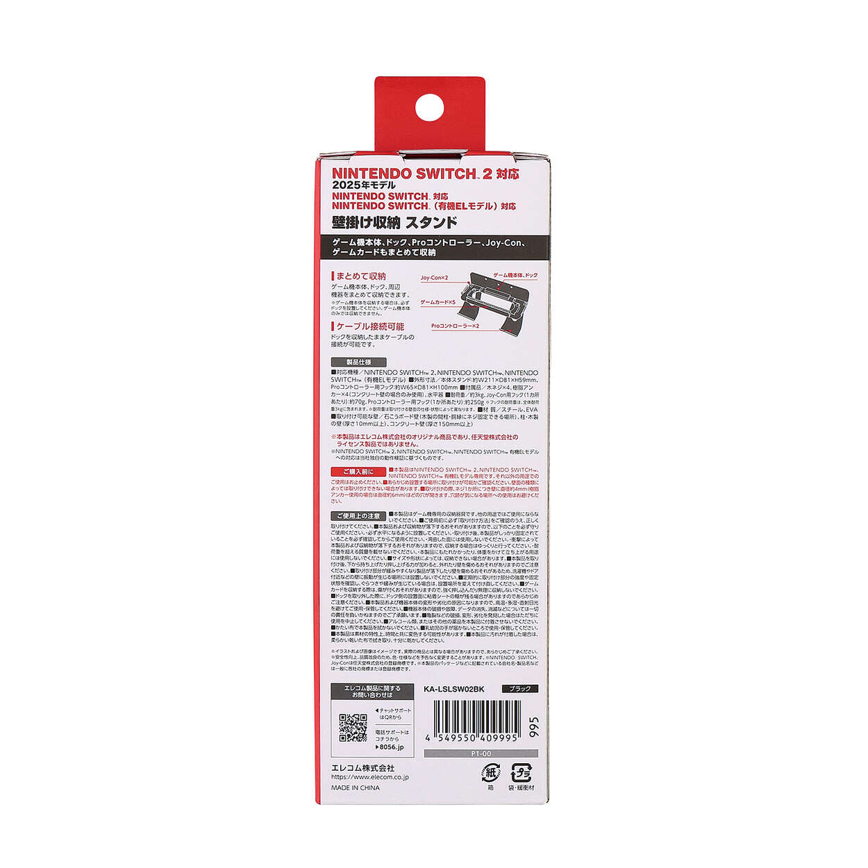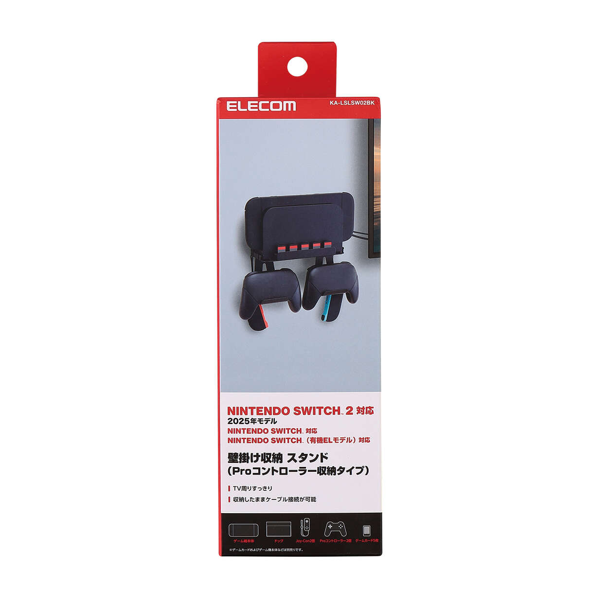 テレビ周りをスッキリ!ゲーム機本体、ドック、周辺機器をまとめて収納できる、NINTENDO SWITCH(TM)シリーズ用の壁掛けスタンドです。ゲームカード5枚、Joy-Con2台、Proコントローラー2台がすっきり収まり、ドックはそのままケーブル接続や充電も行えます。
