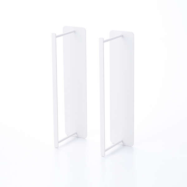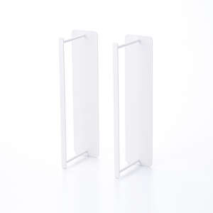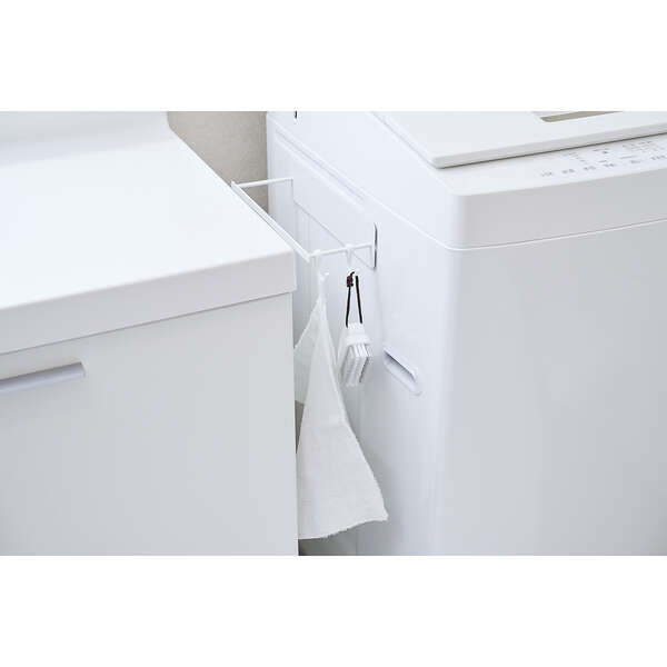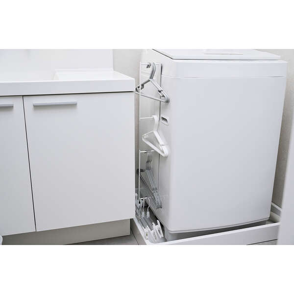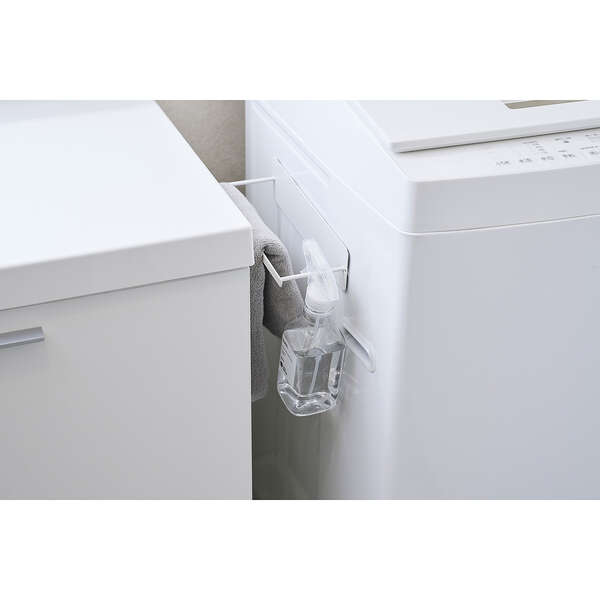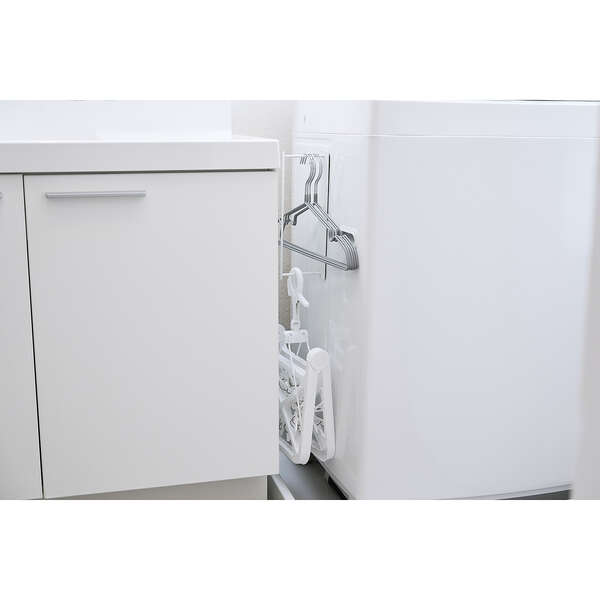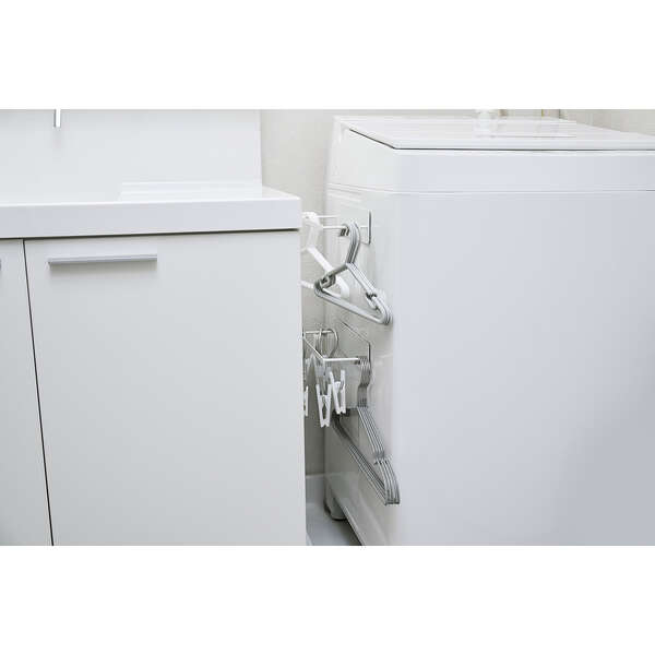 洗濯機横の隙間を有効活用!さまざまなサイズのハンガーをまとめて収納できる、マグネット式ハンガーラックです。高さのあるハンガーやスペースに合わせて、2段に分けて収納可能。横向きにして、スプレーボトルなどを掛けるフックとしても使えます。