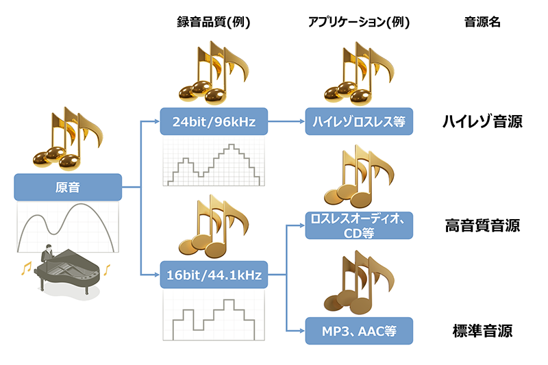ハイレゾ音源は、原音の波形を24bit/96kHz等の高い解像度で、高精細にデジタル保存したコンテンツです。
