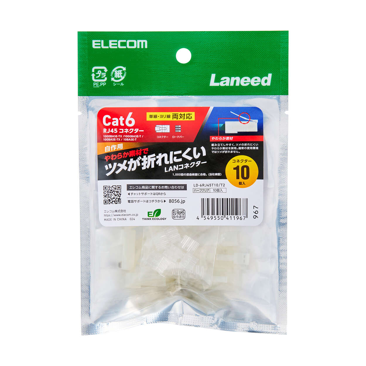 Cat6用のRJ45コネクター10個入りです。単線・ヨリ線の両方に対応しているので、手持ちの材料を有効活用して必要な長さのケーブルを自作する際に活躍します。屈曲に強い高耐久素材を採用し、日常使用でのツメ折れをしっかりガード。脱落を防いで長くご使用できます。ロードバー付きで配線ミスを防ぎます。