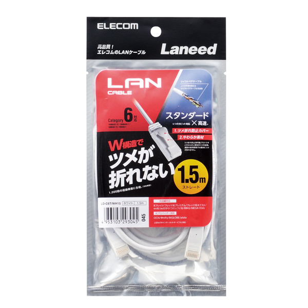 プロテクタと新素材コネクタ採用のダブル構造で、通常の使用環境では絶対にツメが折れない!※周波数帯域250MHzを保証する、ギガビット・イーサネットの高速通信に最適なカテゴリー6対応LANケーブル。※1000回の屈曲検査に合格(当社検証)