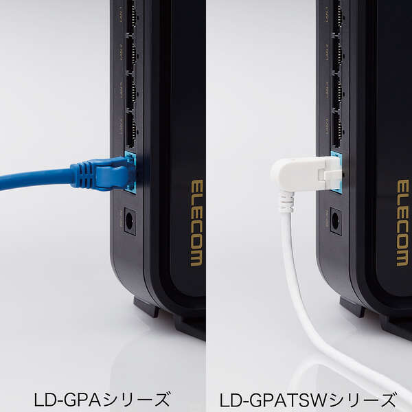 水平方向に左右90度回転できるスイングコネクターを搭載したLANケーブルです。