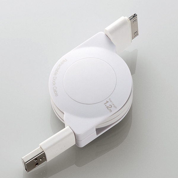 持ち運びや収納に便利な巻取りタイプ。Dockコネクタ搭載のiPhone・iPad・iPodとパソコン・AC充電器のUSBポートを接続して充電・データ通信ができる巻取りタイプのUSBケーブル。