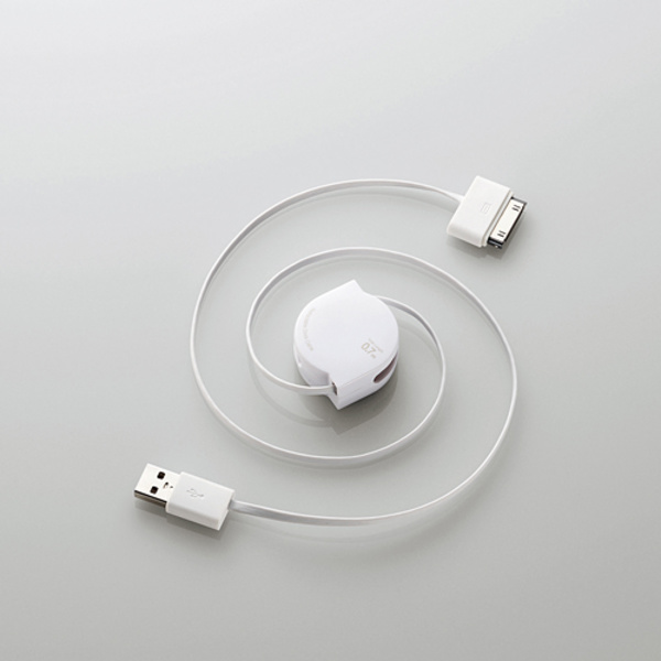 持ち運びや収納に便利な巻取りタイプ。Dockコネクタ搭載のiPhone・iPad・iPodとパソコン・AC充電器のUSBポートを接続して充電・データ通信ができる巻取りタイプのUSBケーブル。